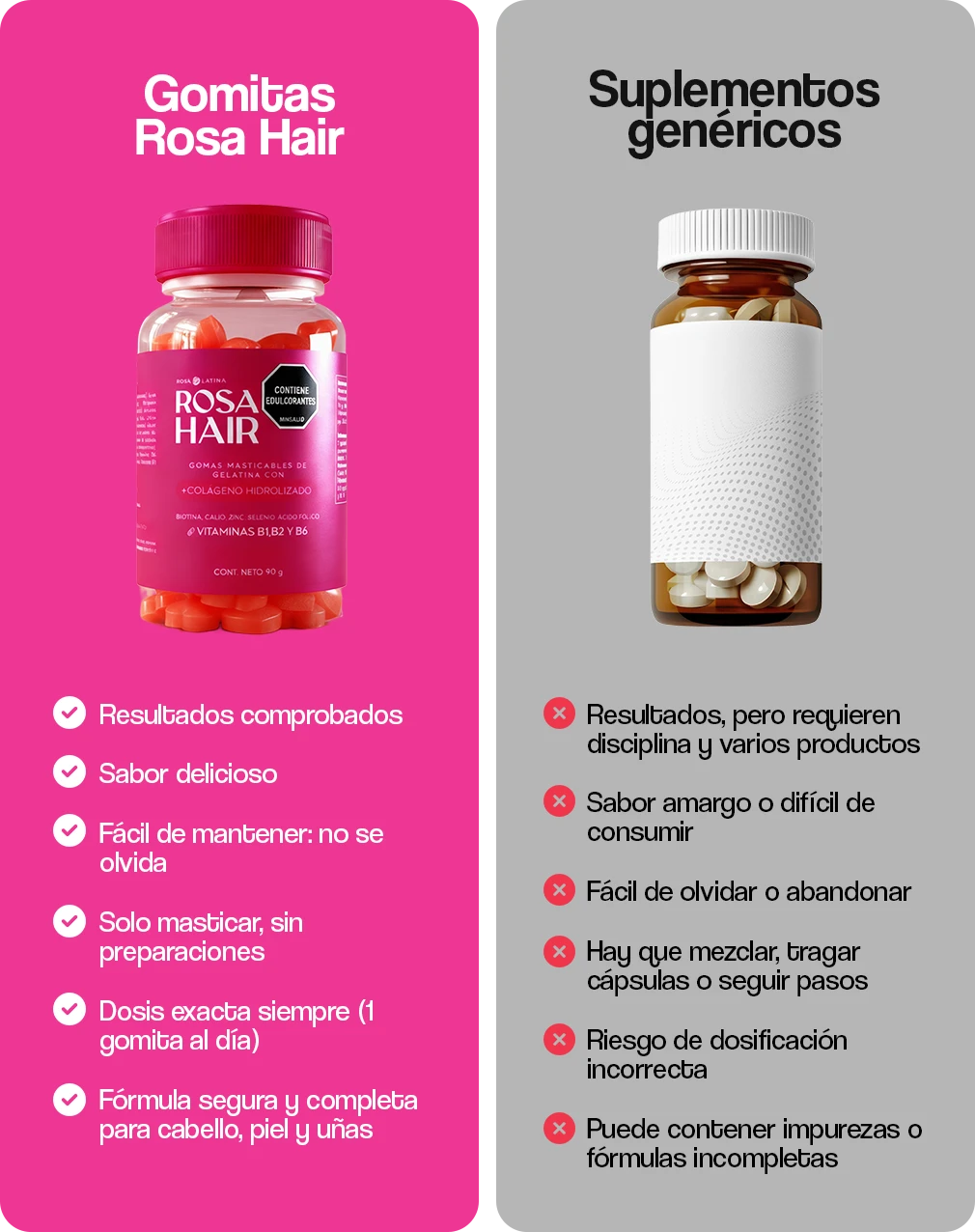 Rosa Hair es tu aliada diaria para decirle adiós al cabello débil, las uñas quebradizas y la piel apagada. Con solo 1 gomita al día, aportas a tu cuerpo los nutrientes clave que muchas veces faltan en tu rutina — sin sabores artificiales, sin excusas.
