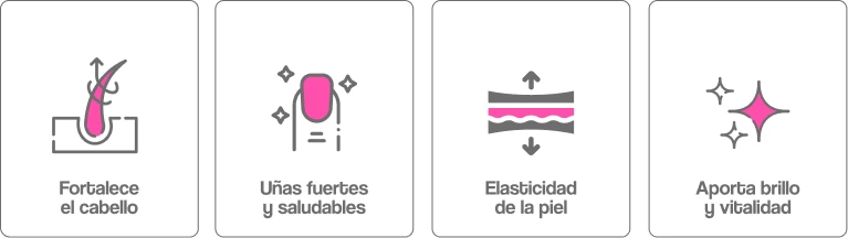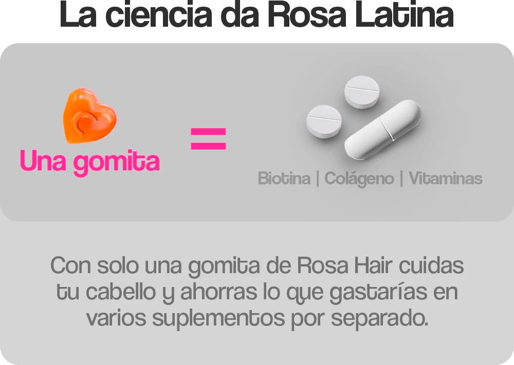 Rosa Hair aporta biotina, colágeno hidrolizado, vitaminas del complejo B y zinc, nutrientes que apoyan el crecimiento y la fortaleza del cabello desde adentro. En casos de posparto o desequilibrios hormonales, recomendamos hablar con tu médico para una evaluación integral. La fórmula apoya la queratinización y la fortaleza de la fibra, lo que puede ayudar a reducir quiebre y dar una apariencia de mayor densidad y brillo con el uso continuo y muchas usuarias reportan uñas menos frágiles y piel con mejor aspecto debido a vitaminas del complejo B y colágeno hidrolizado. Es un beneficio complementario al cuidado del cabello.