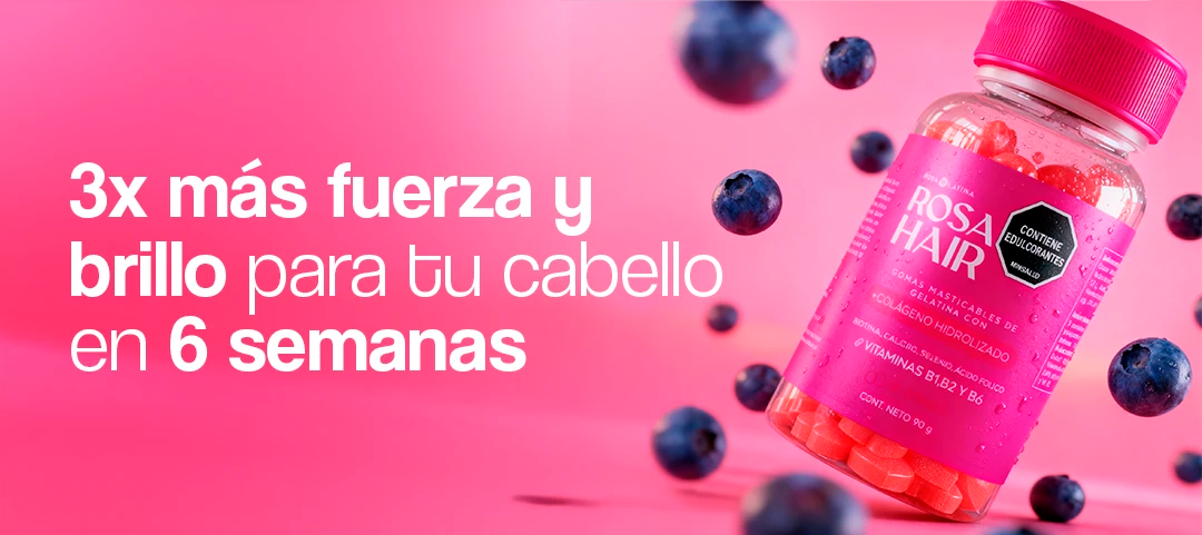 Rosa Hair aporta biotina, colágeno hidrolizado, vitaminas del complejo B y zinc, nutrientes que apoyan el crecimiento y la fortaleza del cabello desde adentro. En casos de posparto o desequilibrios hormonales, recomendamos hablar con tu médico para una evaluación integral. La fórmula apoya la queratinización y la fortaleza de la fibra, lo que puede ayudar a reducir quiebre y dar una apariencia de mayor densidad y brillo con el uso continuo y muchas usuarias reportan uñas menos frágiles y piel con mejor aspecto debido a vitaminas del complejo B y colágeno hidrolizado. Es un beneficio complementario al cuidado del cabello.